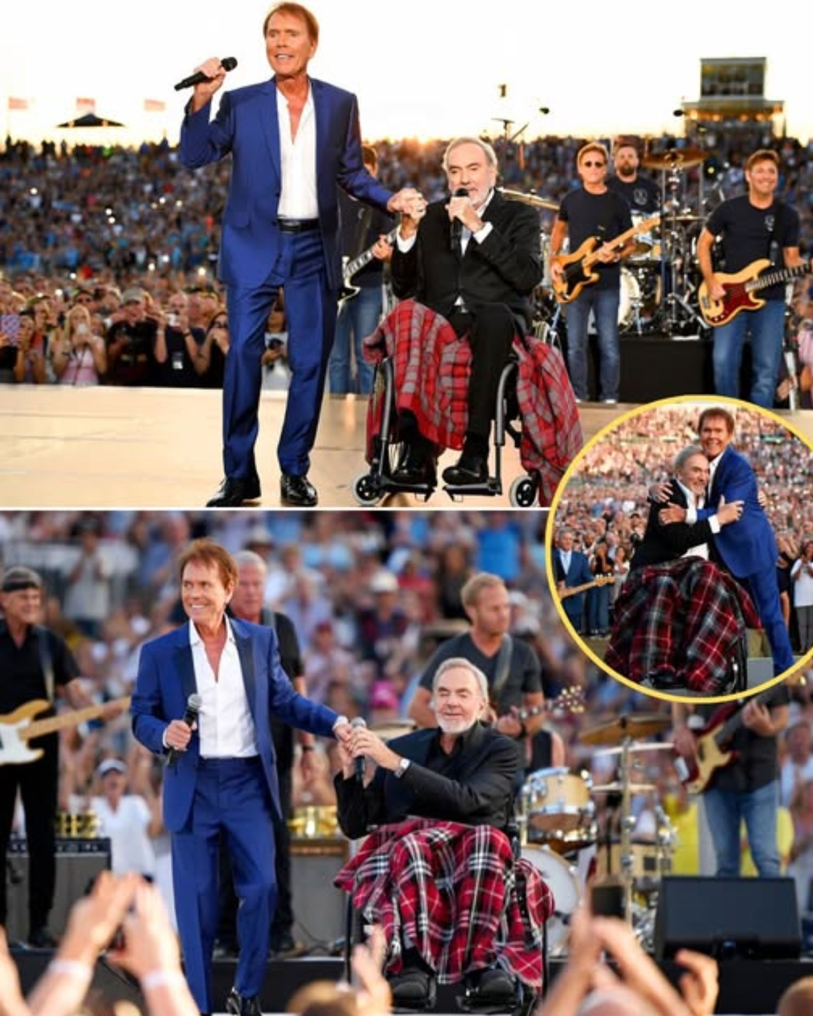 Sir Cliff Richard walked onto the stage with his trademark poise, carrying the weight of six decades of music history with every step. Beside him, gently guided to the center, was Neil Diamond — seated in a wheelchair, a blanket draped across his knees, but with eyes still glowing with the unmistakable spark of a performer who had never stopped being an icon.